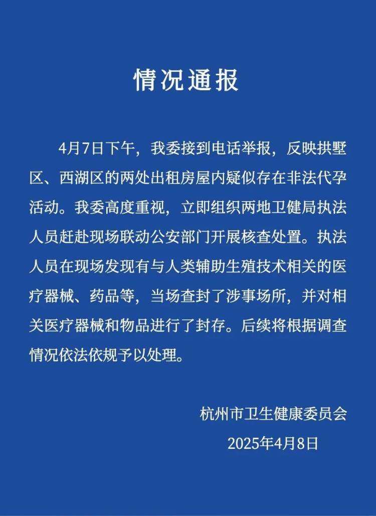 4月8日,杭州卫健委通报“两处出租房屋内疑似存在非法代孕活动”:当场查封涉事场所。