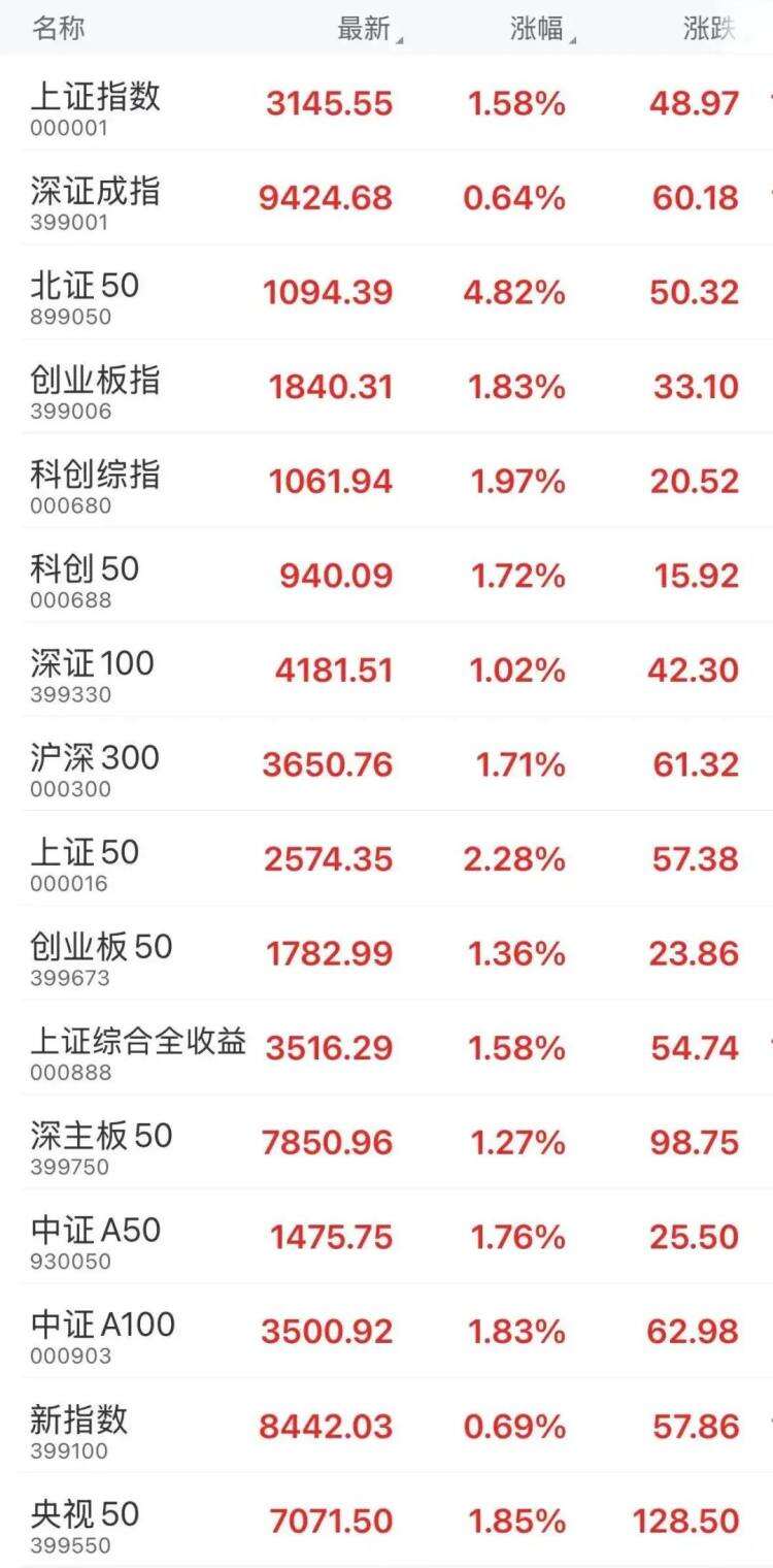 今日收盘,上证指数(000001)涨1.58%,深证成指(399001)涨0.64%,创业板指(399006)涨1.83%。反关税概念股持续发酵,农业股方向领涨;大消费集体反弹,零售、食品、白酒涨幅居前;电力、房地产、金融涨幅居前。详情>>>