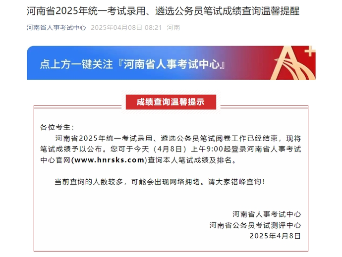 4月8日上午,河南省人事考试中心发布提醒,河南省2025年统一考试录用、遴选公务员笔试成绩公布,今天上午9:00起,考生可登录河南省人事考试中心官网查询本人笔试成绩及排名。