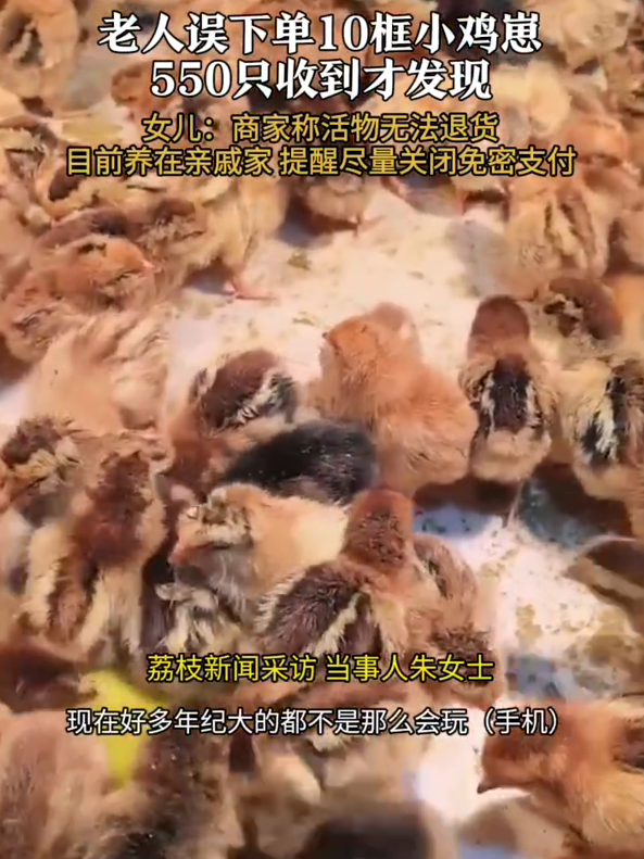 近日,安徽蚌埠,一老人误下单花了790元买了550只小鸡崽。当事人女儿朱女士称,商家称活物不可以退款,目前把这些小鸡崽都养在了亲戚家的鸡棚里,提醒大家把老人手机上的免密支付关闭。