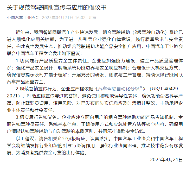 4月21日,中国汽车工业协会发出倡议,进一步引导企业强化自律意识,践行质量承诺与安全责任,推动组合驾驶辅助功能产品安全推广应用。