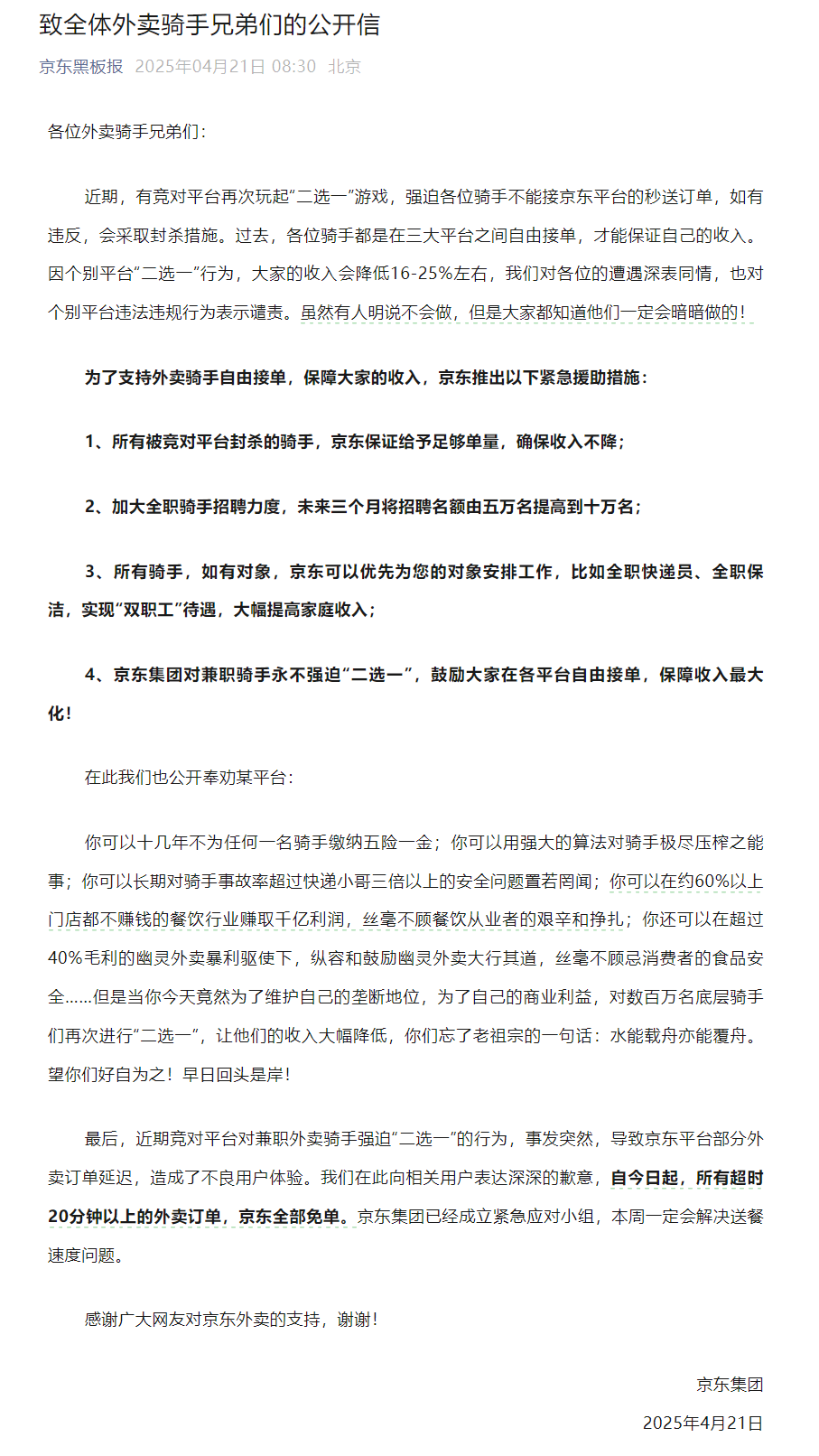 京东集团4月21日发布公开信称,自今日起所有超时20分钟以上的外卖订单全部免单;京东还宣布加大全职骑手招聘力度,对兼职骑手不强迫“二选一”。