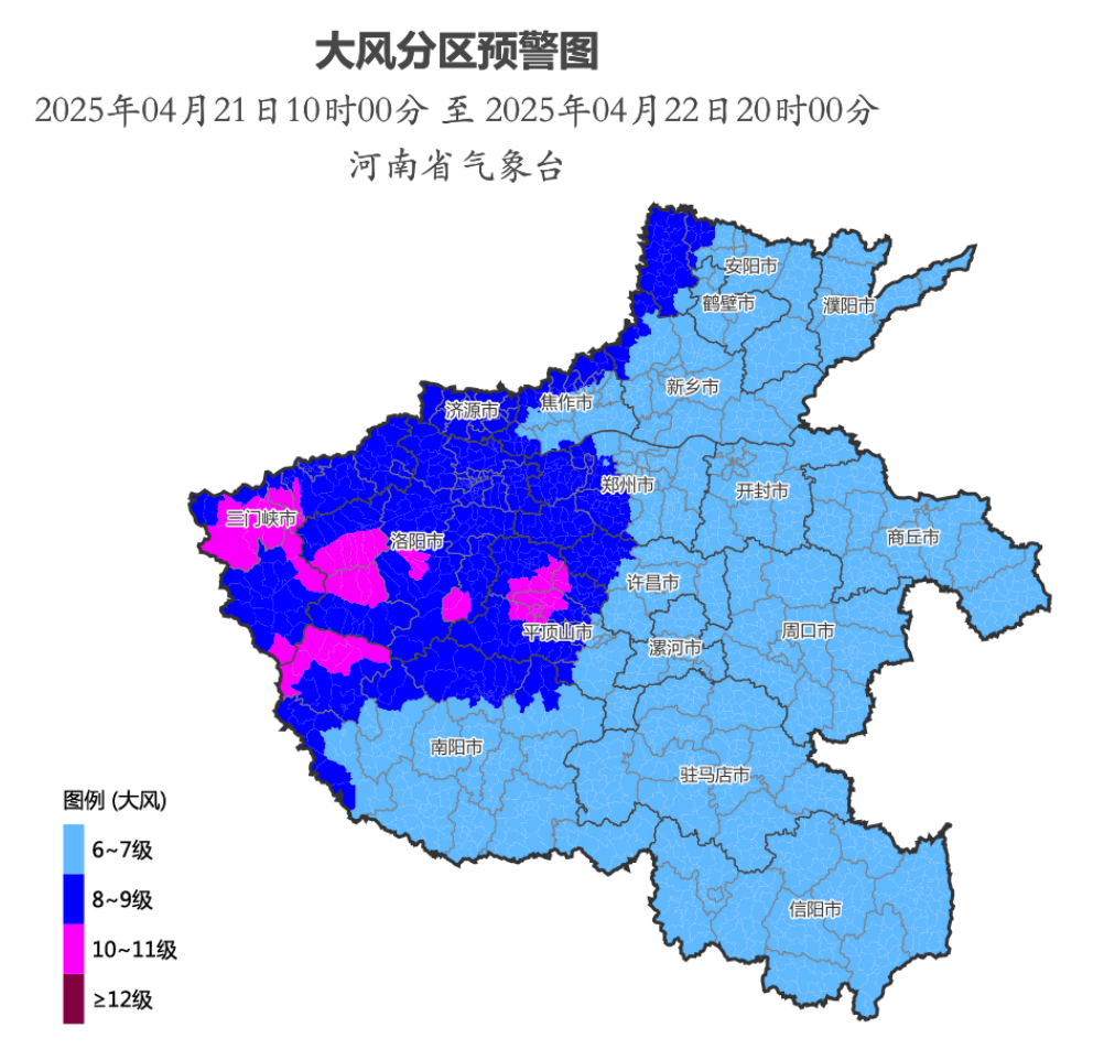河南省气象台4月21日10时发布大风蓝色预警:受冷空气影响,预计4月21日10时至22日20时,我省大部有4到5级西北风或偏北风,阵风6到7级,其中安阳西部、新乡西部、焦作北部、济源、三门峡、洛阳、郑州西部、平顶山中西部、许昌西部、南阳北部部分县(市、区)阵风8到9级,局部可达10到11级。全省大部伴有扬沙或浮尘。