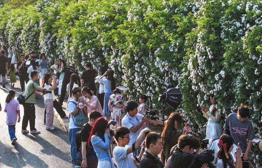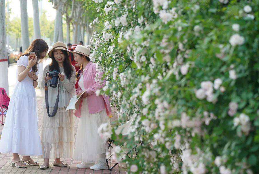 4月20日,位于郑州市经南八路的郑州最长蔷薇花墙吸引了众多游客和摄影爱好者,成了这几天最热门的网红打卡地。这面蔷薇花墙全长近千米,目前进入盛花期,略带粉色调的白蔷薇挂满枝头,诗意十足。