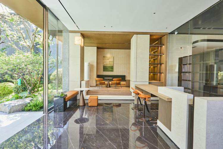 接待台选用伊朗绿奢石,墙面采用西班牙米黄石材,零胶缝艺术工艺,建筑细节被升华为可触摸的艺术品。