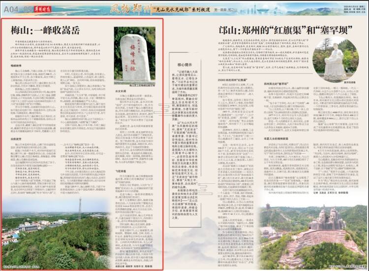 诗中“势联嵩少迥”的观察,不仅道出了梅山与嵩少山脉的地理渊源,更暗含着中原文化血脉相连的精神图谱。而那支287年前的墨笔,也在《郑州志》里留下深情如许:主编《郑州志》时,张钺将“梅峰远眺”列为“郑州八景”之一,志书又以“梅峰远眺”留诗一首: