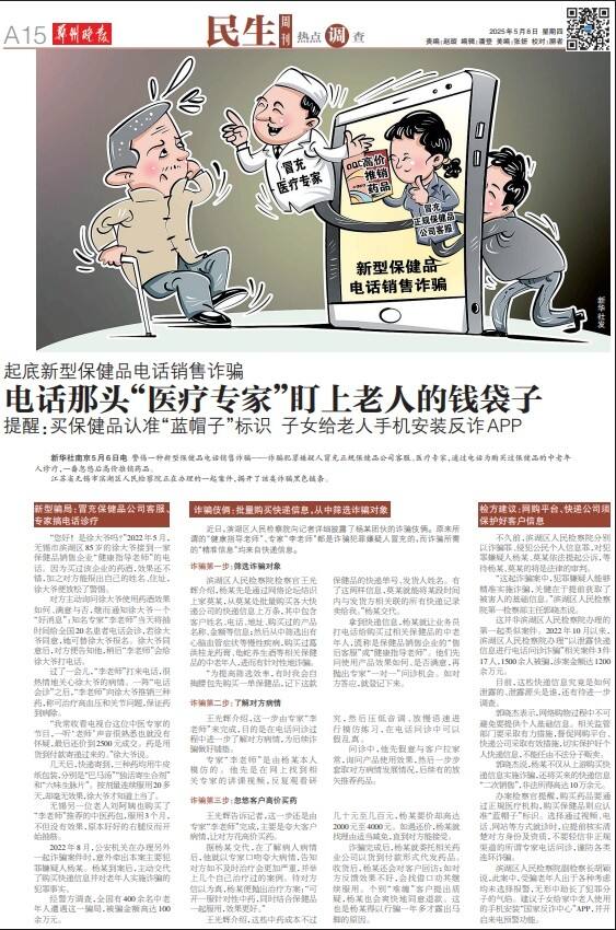新华社南京5月6日电 警惕一种新型保健品电话销售诈骗——诈骗犯罪嫌疑人冒充正规保健品公司客服、医疗专家,通过电话为购买过保健品的中老年人诊疗,一番忽悠后高价推销药品。