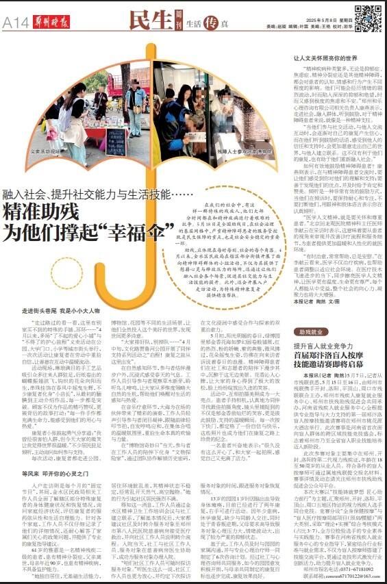 “精神疾病种类繁多,无论是抑郁症、焦虑症、精神分裂症还是其他精神障碍,都会对患者的认知、情感和行为产生不同程度的影响。他们可能会经历情绪的剧烈波动,时而陷入深深的抑郁和绝望,时而又感到极度的焦虑和不安。”郑州和乐心理咨询有限公司相关负责人康燕表示,走进社会,融入群体,听到鼓励,对于精神障碍患者来说,就像是一种精神支柱。