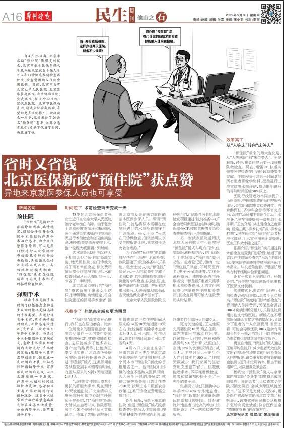 自4月26日起,北京市启动“预住院”医保支付试点,北京市基本医保参保人员及异地来京就医参保人员可以在门诊做完术前检查再住院,检查费用纳入住院费用报销。目前,北京市共有北京大学人民医院、北京清华长庚医院、北京协和医院、宣武医院、航天中心医院5家试点医院。北京市医保局表示,待试点经验成熟后,有望向更多医院推广。新政试点一周多,记者采访了20余名“预住院”患者,大部分患者表示:看病不仅省了时间,而且省了钱。