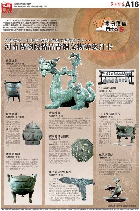 夏、商、周三代被称为中国的青铜时代,在这近两千年的历史时期,中国的政治、经济与文化中心始终在河南境内,河南出土青铜器的数量与质量在全国首屈一指。河南博物院“九大镇院之宝”中,青铜文物(莲鹤方壶、云纹铜禁、妇好鸮尊、杜岭方鼎)占居四席。除列入镇院之宝的4件青铜文物外,院内还有不少青铜器历史文物价值颇高,值得参观打卡。
