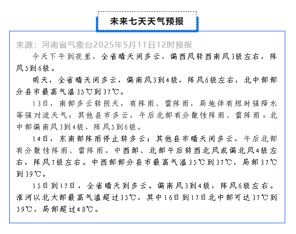 据河南气象,明天开始,我省迎来高温天气。明天北中部部分县市最高气温达35℃到37℃,13日略有波动,14日中西部部分县市最高气温将冲至35℃到37℃,局部37℃到39℃。15日到17日,淮河以北大部最高气温将超35℃,其中16日至17日,北中部可达37℃到39℃,局部超过40℃。