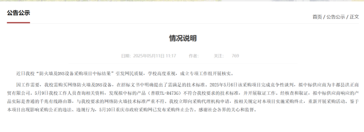 近日,有网友称重庆三峡学院花75万元采购市价299元产品,学院回应:按相关规定对本项目实施采购终止,重新开展采购活动。