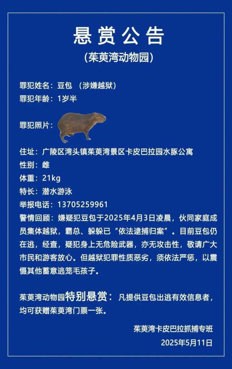 5月11日,扬州茱萸湾风景区管理处发布悬赏公告,称茱萸湾动物园的卡皮巴拉豆包于4月3日出逃,至今已达40天。