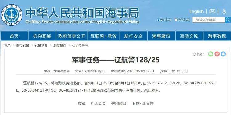 据中国海事局网站消息,大连海事局发布航行警告,5月11日16时至6月1日16时,渤海海峡黄海北部部分海域执行军事任务,禁止驶入。