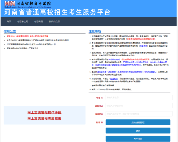 河南省2025年普通高校招生网上填报志愿模拟演练于5月11日9时开始,至12日17时结束。参加演练的考生为2025年普通高校招生统一考试考生,对口、专升本及已被高职单招录取的普通类考生除外。演练批次包括普通本科提前批、普通本科批、艺术本科批、体育本科批。考生需登录河南省普通高校招生考生服务平台进行演练,应妥善保管个人信息及密码,模拟数据仅用于演练。