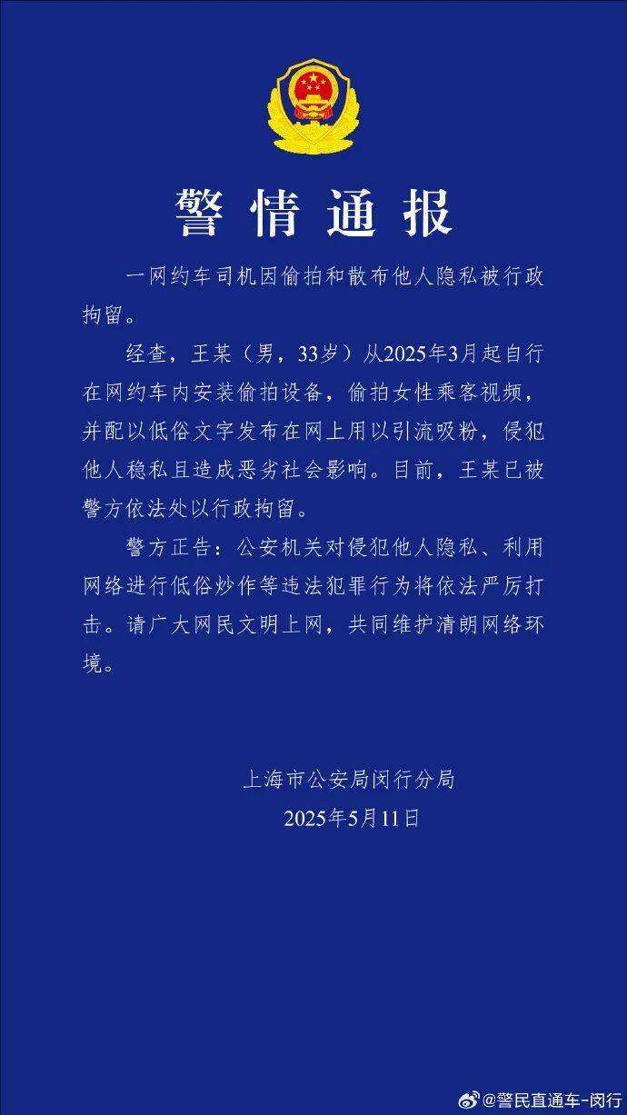 5月11日,上海闵行警方通报,33岁网约车司机王某自2025年3月起,在网约车内装偷拍设备,偷拍女乘客视频并配低俗文字发网上吸粉,侵犯他人隐私造成恶劣影响,已被行政拘留。