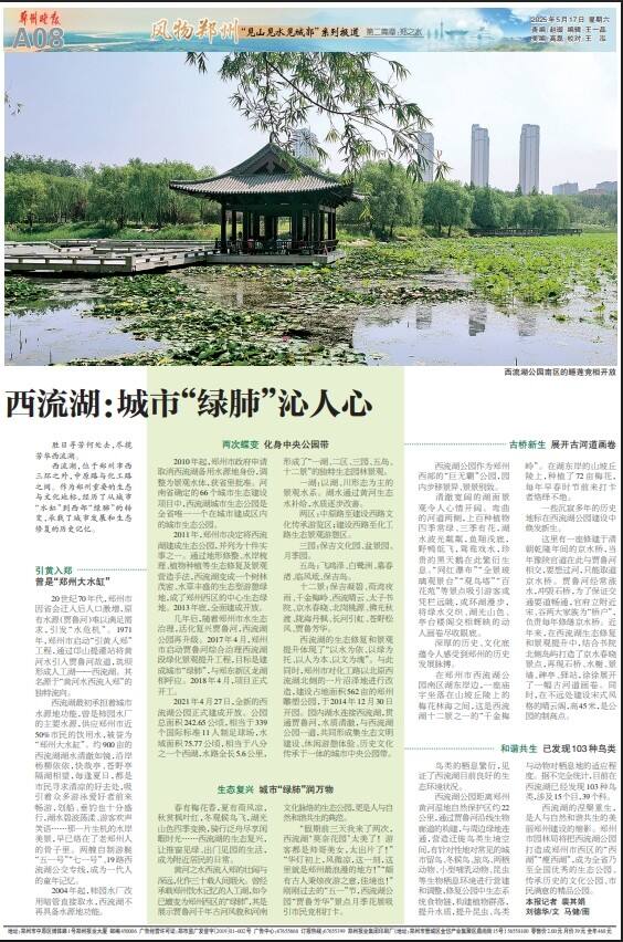 西流湖最初承担着城市水源地功能,曾是柿园水厂的主要水源,供应郑州市近50%市民的饮用水,被誉为“郑州大水缸”。约900亩的西流湖湖水清澈如镜,沿岸杨柳依依,快哉亭、苍野亭隔湖相望,每逢夏日,都是市民寻求清凉的好去处,吸引着众多游泳爱好者前来畅游,划船、垂钓也十分盛行,湖水碧波荡漾、游客欢声笑语……那一片生机的水岸美景,早已烙在了老郑州人的骨子里。两艘自制游艇“五一号”“七一号”、19路西流湖公交专线,成为一代人的童年记忆。