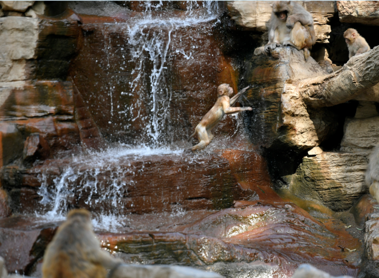 在鸵鸟区,一只水龙头不停流出小股清水,下面一个小水塘,一只鸵鸟不停地在啜饮。而在猴山,一群活泼的小猴子围着一挂小瀑布在上下腾跃,嬉戏打闹。而年长一些的猴子,则在瀑布顶端喝水。