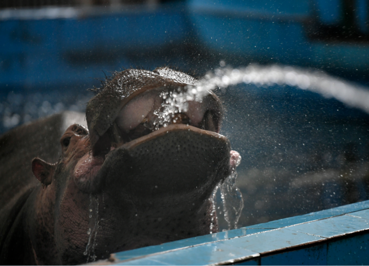 在河马馆,太阳晒得游客迈不开步。河马们也懒洋洋的,面对一个大大的水池,有的在怡然游泳,有的在池边一动不动。一位工作人员拿着水管走过来,对着一只河马的嘴冲凉,河马张开脸盆大的嘴,让清凉的自来水冲进嘴里,享受着清凉时光。