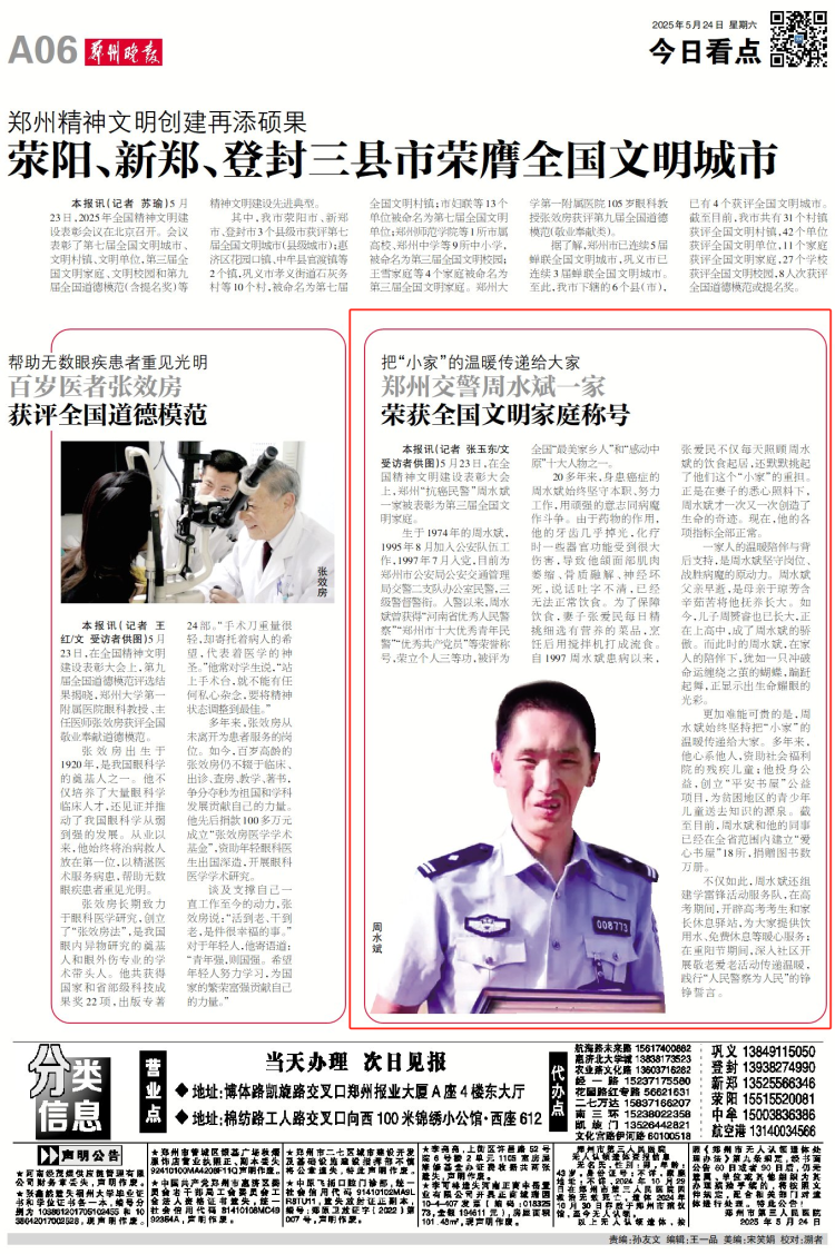 5月23日,在全国精神文明建设表彰大会上,郑州“抗癌民警”周水斌一家被表彰为第三届全国文明家庭。