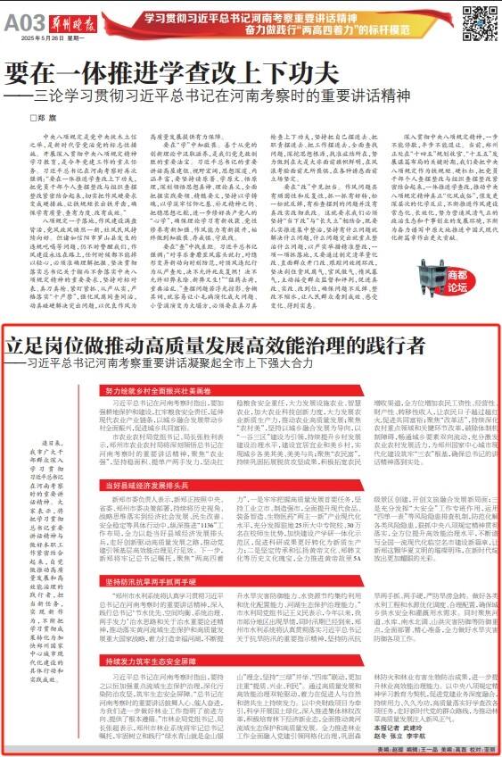 连日来,我市广大干部群众深入学习贯彻习近平总书记在河南考察时的重要讲话精神。大家表示,将把学习贯彻总书记重要讲话精神与做好本职工作紧密结合起来,自觉做推动高质量发展和高效能治理的践行者,担当新任务,实现新作为,不断把学习贯彻成果转化为加快郑州国家中心城市现代化建设的具体行动和实践成效。