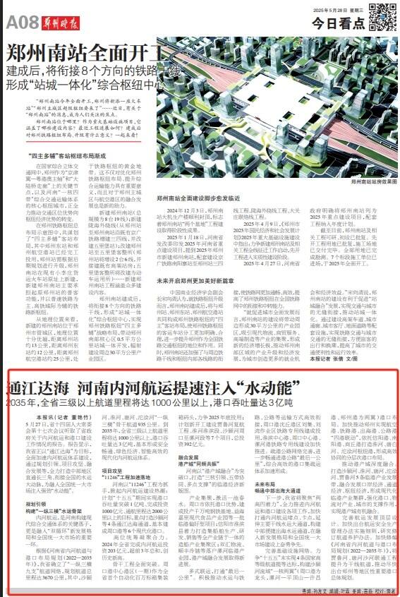 骨干工程全面突破。周口港中心港区(一期)作为全省首个自动化百万标箱集装箱码头,力争2025年底投用;计划新开工建设贾鲁河复航工程、淮河淮滨段、沙颍河周口至漯河段等7个项目,总投资392亿元。