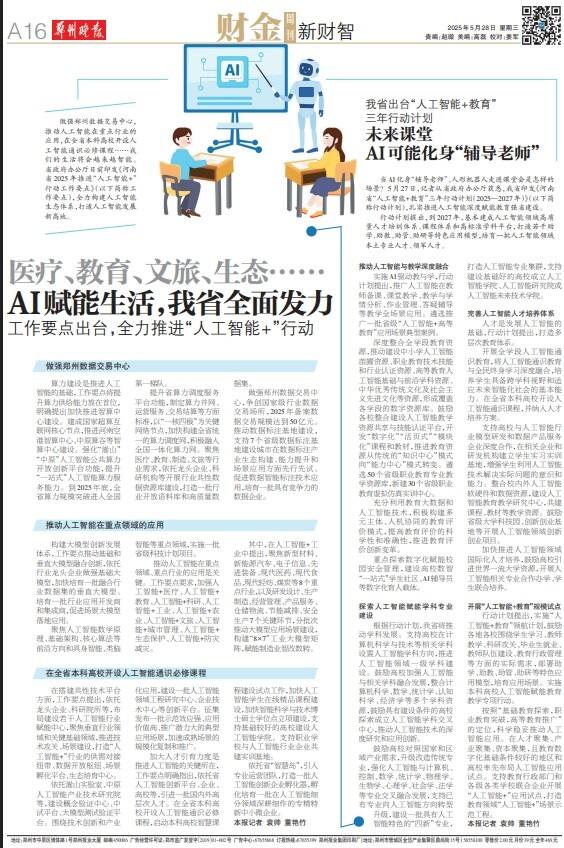 当AI化身“辅导老师”、人形机器人走进课堂会是怎样的场景?5月27日,记者从省政府办公厅获悉,我省印发《河南省“人工智能+教育”三年行动计划(2025—2027年)》(以下简称行动计划),扎实推进人工智能深度赋能教育强省建设。