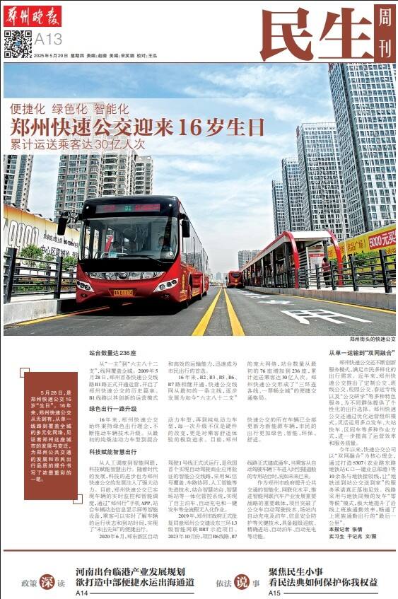 16年来,B2、B3、B5、B6、B7路相继开通,快速公交线网从最初的一条主线,逐步发展为如今“六主八十二支”的庞大网络,站台数量从最初的76座增加到236座,累计运送乘客达30亿人次。郑州快速公交形成了“三环连各线、一票畅全城”的便捷交通格局。
