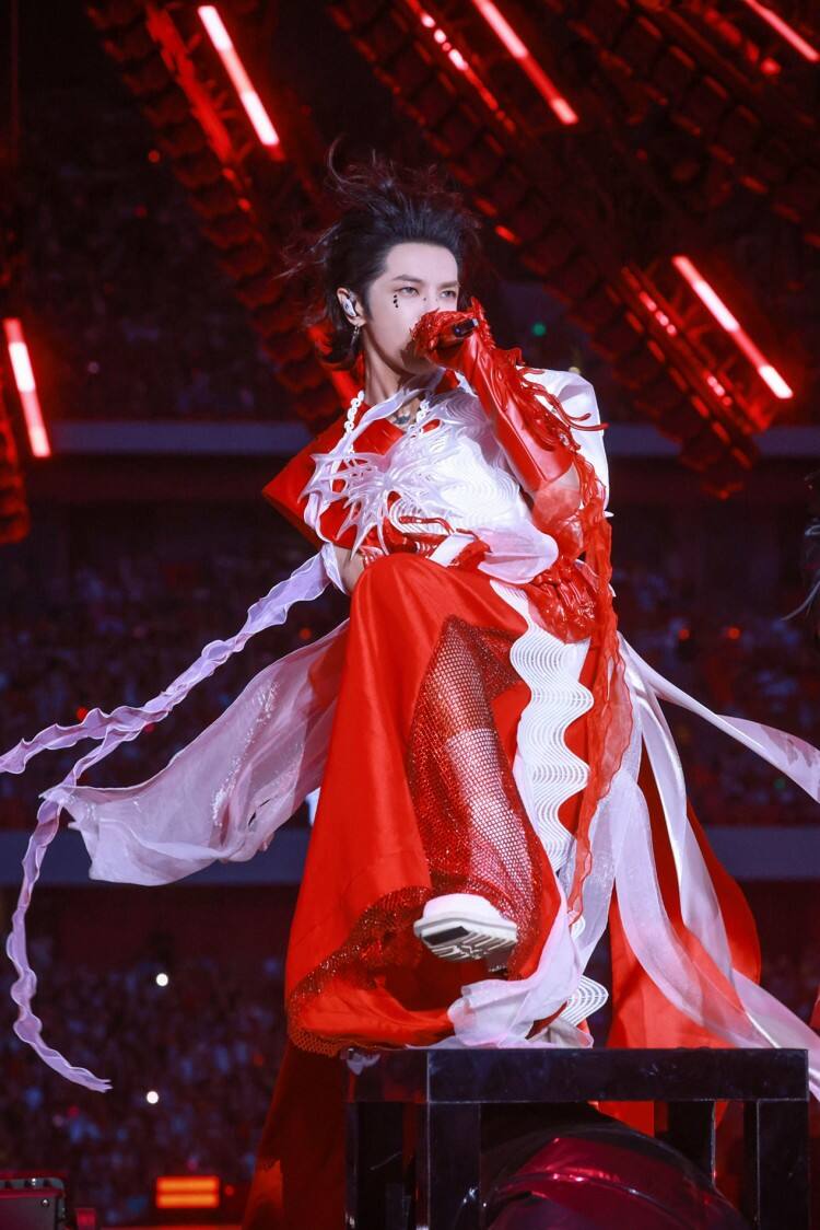 当他唱到《忒修斯的船》时,跟着悠扬的节奏行云流水地打了一套太极拳。刚柔并济的拳路化作视觉化的旋律,推掌间带起的气流仿佛裹挟着音符的涟漪,太极风骨与音乐完美融合。他还提到“太极的起源地就是河南,很奇妙的缘分”,并特别感谢了郑州这座美丽的城市。华晨宇入乡随俗,将地域文化特色融入音乐舞台之中,为地域文化的传播与创新注入了新的活力。