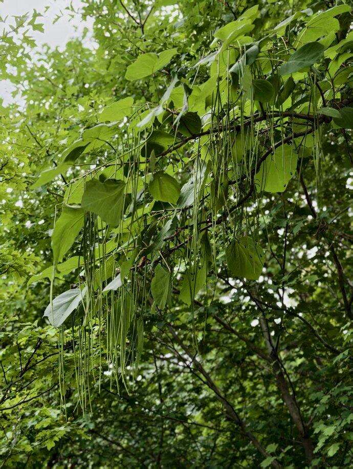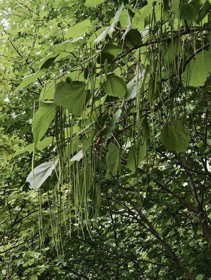 梓树是原产中国的古典名木,曾与桑树并称“桑梓”,是古代文人笔下故乡的代名词。梓树是紫葳科梓属落叶乔木,成年树高可达15米,其最显著的特征是心形巨大叶片,长宽可达25厘米,叶片边缘常有3~5个浅裂。每年5~6月,枝头会绽放出淡黄色带紫斑的钟形花,花落之后,便抽出细长的蒴果(可长达30厘米)垂挂枝头,宛如挂着无数“豆角”,因此北方民间也称它“面条树”。