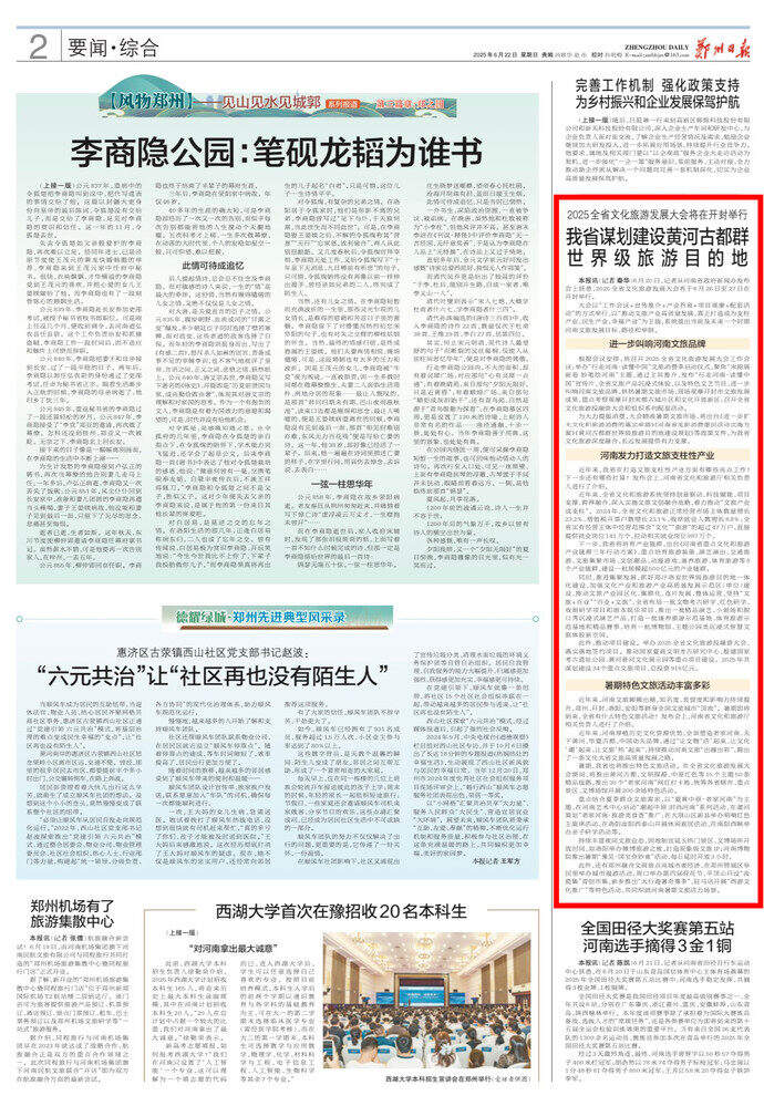 此外,推动项目建设。举办2025全省文化旅游投融资大会,落实落地签约项目。推动国家夏商文明考古研究中心、殷墟国家考古遗址公园、黄河悬河文化展示园等重点项目建设。2025年共谋划建设34个重点文旅项目、总投资918亿元。