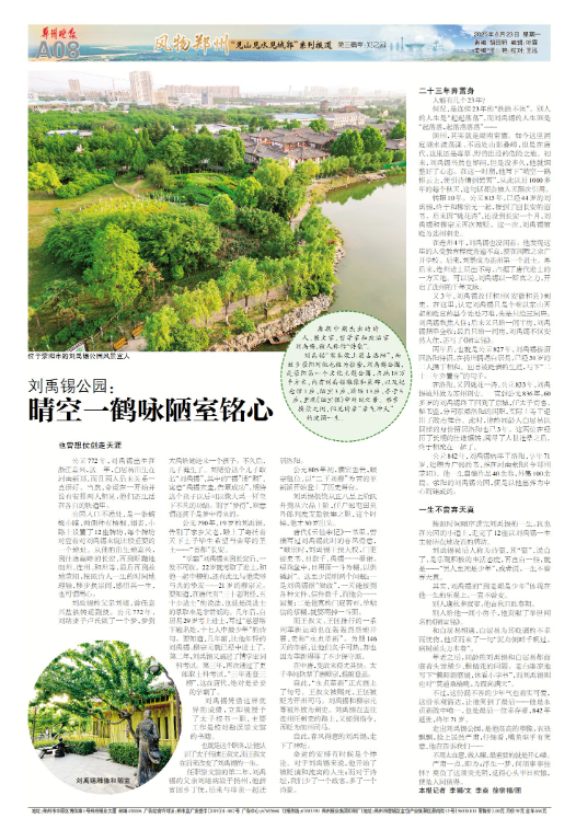 刘禹锡“家本荥上籍占洛阳”,而故乡荥阳对他也极为推崇,刘禹锡公园,是荥阳第一个文化主题公园,占地18万平方米,内有刘禹锡雕像和墓碑,以及纪念馆1座、陋室3座、牌坊13座、亭子5座,重现《陋室铭》中所说之景。移步换景之间,但见诗豪“豪气冲天”的波澜一生。