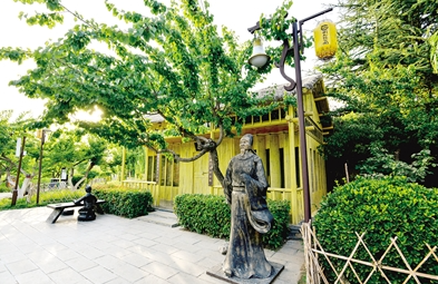 公园入口不远处,是一条蜿蜒小路,两侧种有梧桐、银杏,小路上设置了12座牌坊,每个牌坊对应着对刘禹锡来说比较重要的一个地址。从他的出生地嘉兴,到仕途巅峰的长安,再到贬黜地朗州、连州、和州等,最后再到故地荥阳,按照诗人一生的时间地理轴,移步换景间,感悟其一生,也可谓用心。