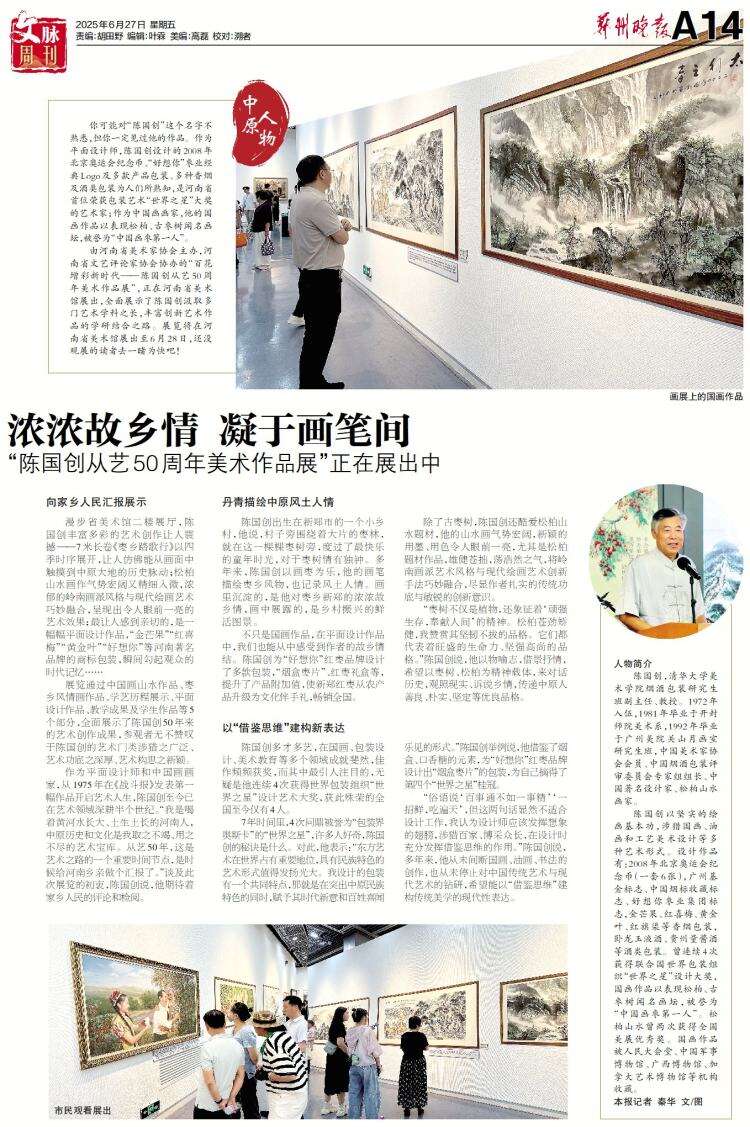 作为平面设计师和中国画画家,从1975年在《战斗报》发表第一幅作品开启艺术人生,陈国创至今已在艺术领域深耕半个世纪。“我是喝着黄河水长大、土生土长的河南人,中原历史和文化是我取之不竭、用之不尽的艺术宝库。从艺50年,这是艺术之路的一个重要时间节点,是时候给河南乡亲做个汇报了。”谈及此次展览的初衷,陈国创说,他期待着家乡人民的评论和检阅。