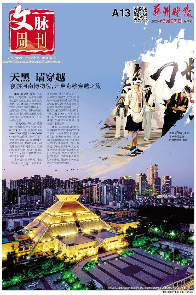 本报讯(记者 秦华)夜幕降临,文明不眠。白天热浪褪去,属于文化的星光也将正式点亮。6月25日起,河南博物院“豫见·国宝奇妙夜”暑期延时开放活动正式开启,《唐宫夜宴》XR大空间沉浸展夜展模式也同步启动,带大家开启一场奇妙穿越之旅。