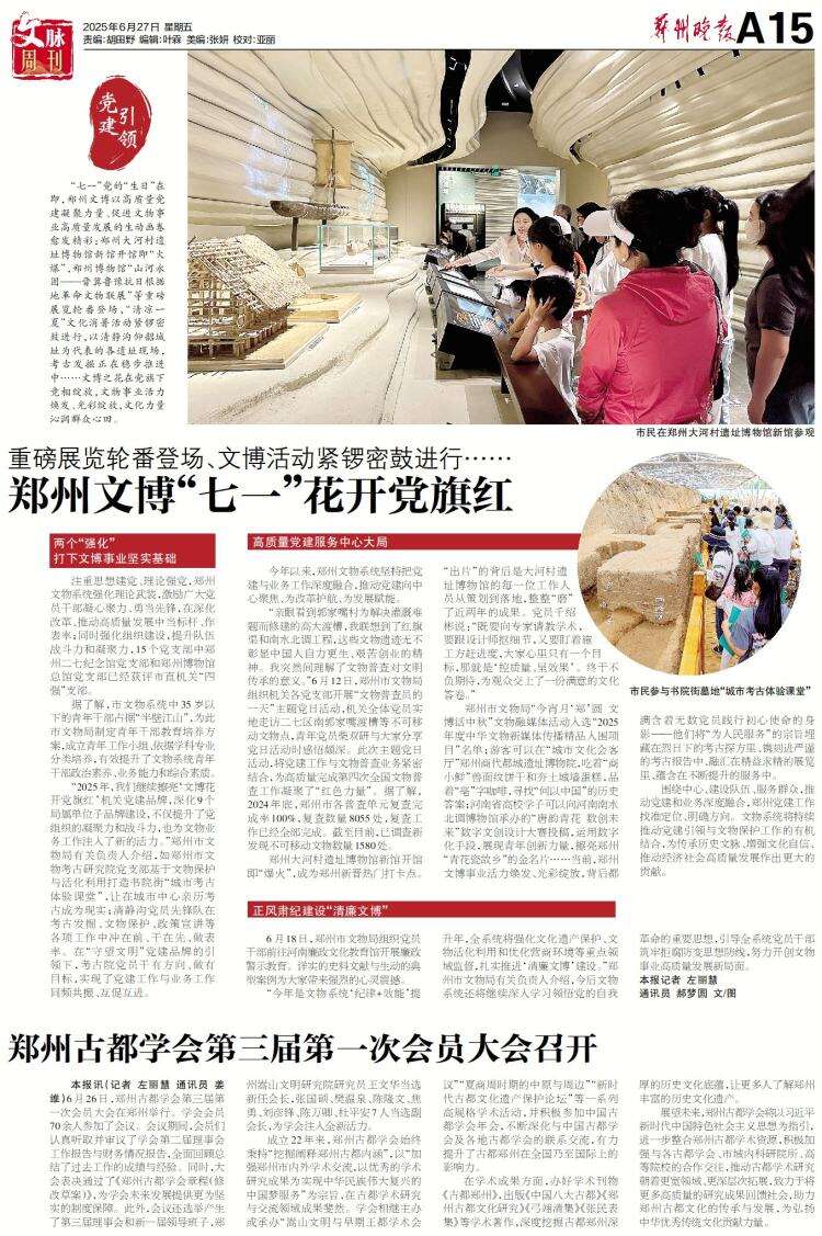 “七一”党的“生日”在即,郑州文博以高质量党建凝聚力量、促进文物事业高质量发展的生动画卷愈发精彩:郑州大河村遗址博物馆新馆开馆即“火爆”,郑州博物馆“山河永固——晋冀鲁豫抗日根据地革命文物联展”等重磅展览轮番登场,“清凉一夏”文化消暑活动紧锣密鼓进行,以清静沟仰韶城址为代表的各遗址现场,考古发掘正在稳步推进中……文博之花在党旗下竞相绽放,文物事业活力焕发、光彩绽放,文化力量沁润群众心田。