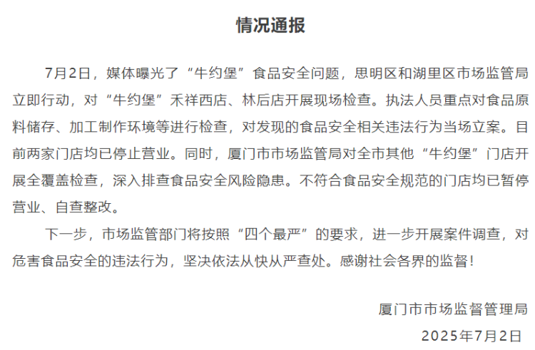 知名连锁汉堡店“牛约堡”被曝蟑螂乱爬,7月2日,厦门市市场监督管理局发布情况通报:已立案调查,涉事两家门店停业。