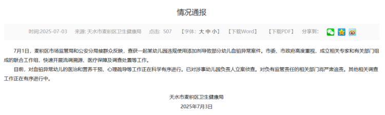 7月3日,甘肃省天水市麦积区卫生健康局发布情况通报称,查获一起某幼儿园违规使用添加剂导致部分幼儿血铅异常案件。目前,对血铅异常幼儿的医治和营养干预、心理疏导等工作正在科学有序进行。已对涉事幼儿园负责人立案侦查。