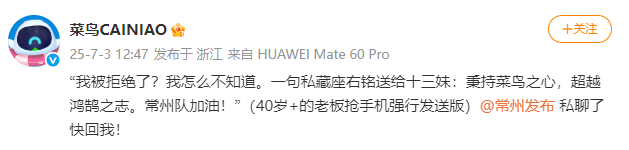 7月3日,就近期网络上“菜鸟想要冠名常州队被婉拒”有关传闻,菜鸟方面回应称:“我被拒绝了?我怎么不知道。一句私藏座右铭送给十三妹:秉持菜鸟之心,超越鸿鹄之志。常州队加油!”