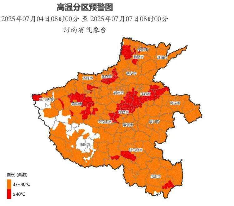 河南省气象台7月3日17时发布高温橙色预警:预计7月4日至6日,我省将持续高温闷热天气,全省大部最高气温在37℃以上。4日白天,安阳西部、焦作、三门峡北部、洛阳中北部、信阳东南部局部最高气温可达40℃以上。5日白天,安阳西部、鹤壁、洛阳东部、郑州东部、开封、商丘西部、平顶山西部、许昌北部、驻马店南部局部最高气温可达40℃以上。6日白天,洛阳中部、郑州东南部、开封、商丘西部、平顶山东部、许昌局部最高气温可达40℃以上。