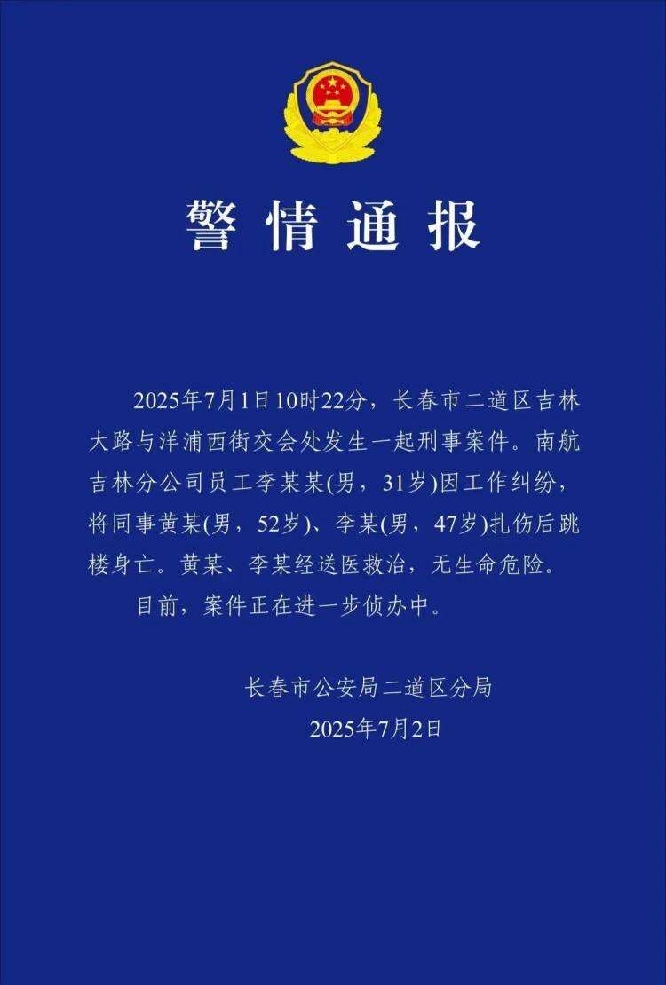 长春警方通报南航机长伤人案:员工李某某(男,31岁)因工作纠纷扎伤两名同事后跳楼身亡。