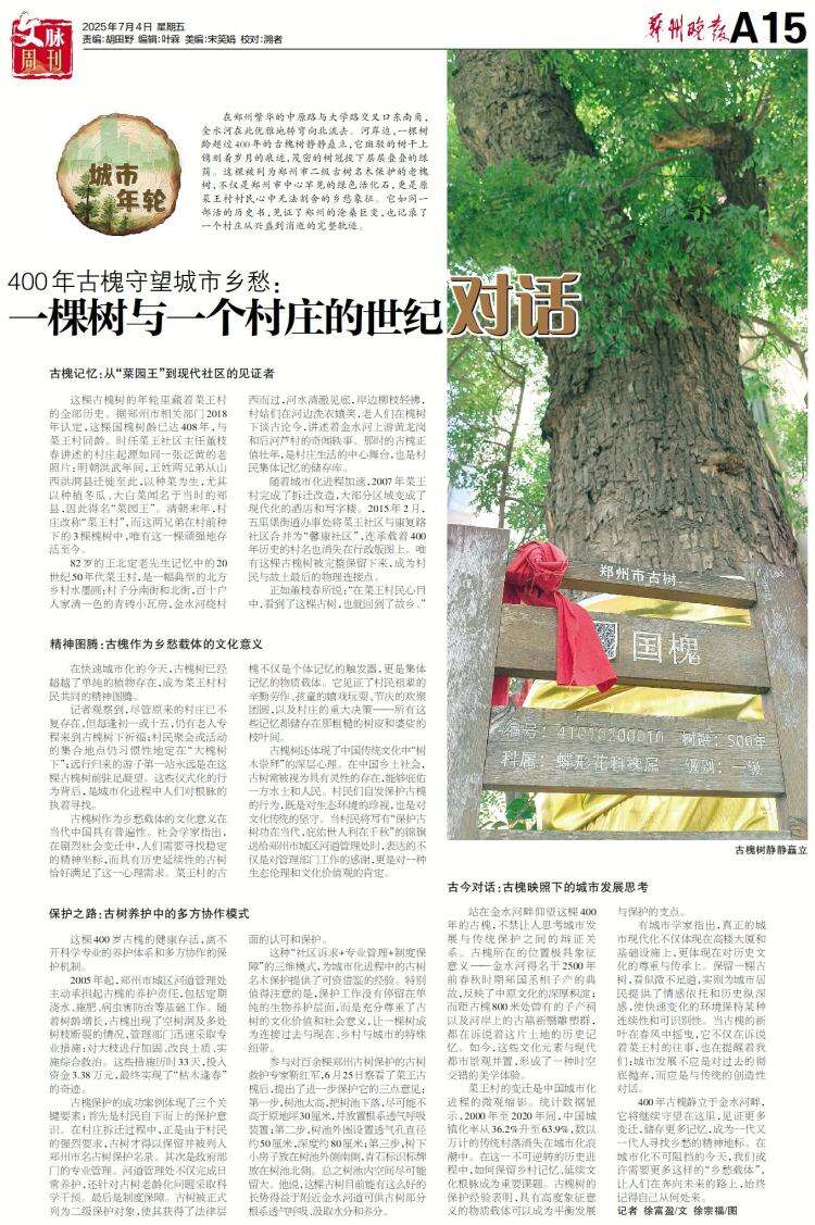400年古槐静立于金水河畔,它将继续守望在这里,见证更多变迁,储存更多记忆,成为一代又一代人寻找乡愁的精神地标。在城市化不可阻挡的今天,我们或许需要更多这样的“乡愁载体”,让人们在奔向未来的路上,始终记得自己从何处来。