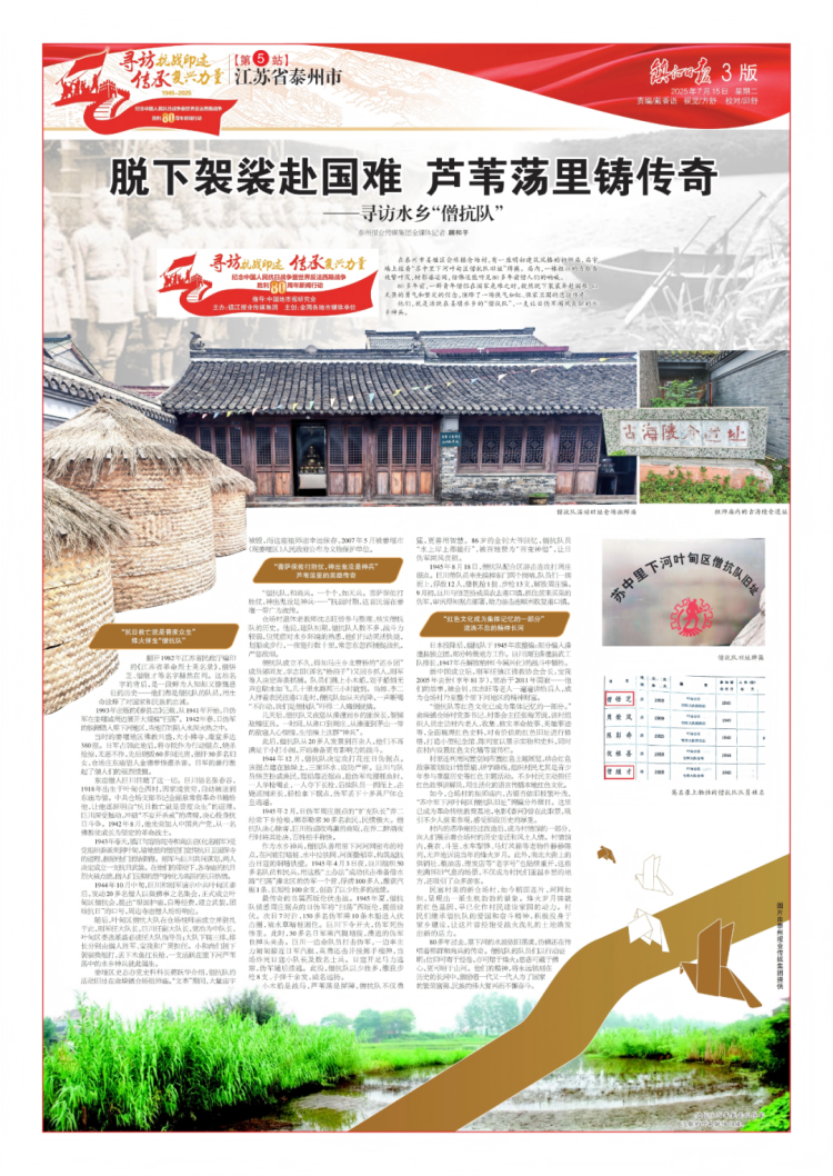 在泰州市姜堰区俞垛镇仓场村,有一座明初建筑风格的祖师庙,庙宇墙上挂着“苏中里下河叶甸区僧抗队旧址”牌匾。庙内,一株粗壮的古银杏枝繁叶茂,树影婆娑间,仿佛还能听见80多年前僧人们的呐喊。80多年前,一群青年僧侣在国家危难之时,毅然脱下袈裟奔赴国难,以无畏的勇气和坚定的信念,演绎了一场侠气如虹、保家卫国的悲壮传奇。他们,就是活跃在姜堰水乡的僧抗队,一支让日伪军闻风丧胆的水乡神兵。