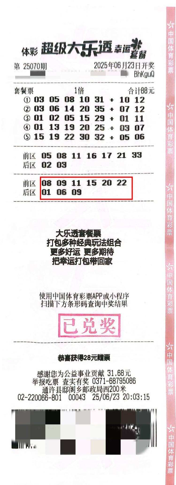 在6月23日,开封购彩者马先生(化姓)与体彩大乐透第25070期三等奖撞了个满怀。他凭借一张88元的套餐票中得当期大乐透三等奖3注及若干小奖,奖金累计3万余元。马先生是体彩大乐透忠实粉,并保持着理性的购彩习惯。他觉得套餐投注不仅有单式还有复式,号码选择多。幸运的是他的套餐票中复式投注一举中得3注三等奖。他说:“平时我买彩票就是想着生活中有点娱乐和期待,每次都当做消遣。”
