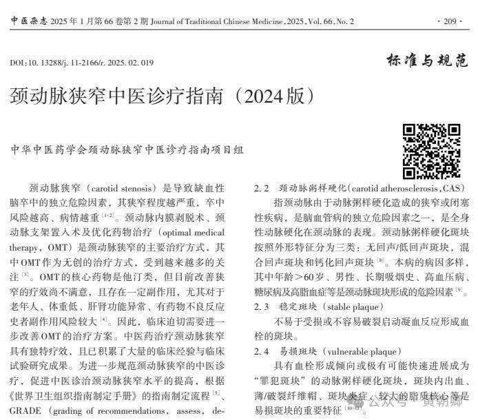 颈动脉狭窄 (carotid stenosis) 是导致缺血性脑卒中的独立危险因素,其狭窄程度越严重,卒中风险越高、病情越重。颈动脉内膜剥脱术、颈动脉支架置入术及优化药物治疗 (OMT) 是颈动脉狭窄的主要治疗方式,其中 OMT 作为无创的治疗方式,受到越来越多的关注。OMT 的核心药物是他汀类,但目前改善狭窄的疗效尚不满意,且存在一定副作用,尤其对于老年人、体重低、肝肾功能异常、有药物不良反应史者副作用风险较大。因此,临床迫切需要进一步改善 OMT 的治疗方案。中医药治疗颈动脉狭窄具有独特疗效,且已积累了大量的临床经验与临床试验研究成果。为进一步规范颈动脉狭窄的中医诊疗,促进中医诊治颈动脉狭窄水平的提高,根据《世界卫生组织指南制定手册》的指南制定流程[5]、GRADE方法[6] 及中华中医药学会团体标准管理办法[7] 相关要求,遵循 “循证为主、共识为辅、经验为鉴”的推荐原则,结合中医诊疗的特色以及中国实际情况的特点,制定了《颈动脉狭窄中医诊疗指南》(以下简称本指南),经中华 中 医 药 学 会 立 项 并 审 议 发 布 (标 准 编 号:T/CACM 1611-2024)。指南制定的方法和步骤详见附件1。