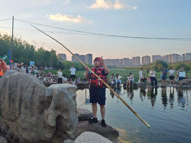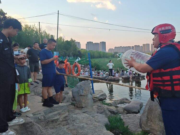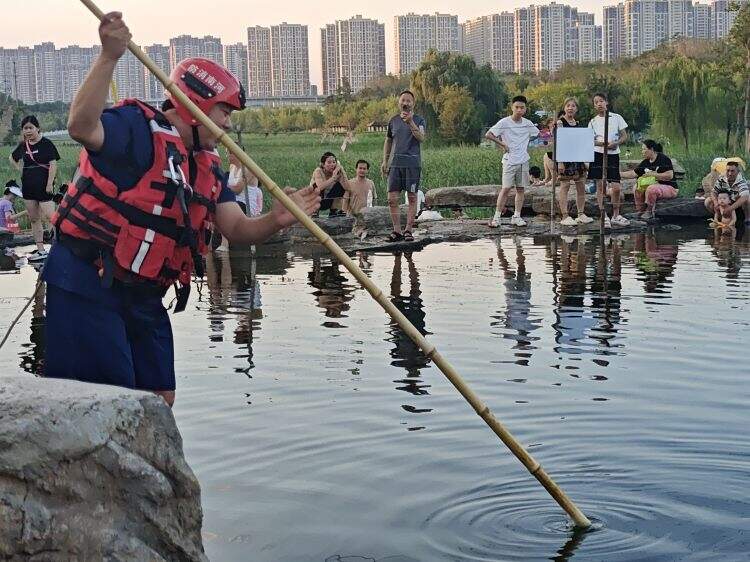 19时许,中原区消防救援大队明伦岛消防站站长胡庆良来到4号坝前进行防溺水宣传,他身穿救生衣手持竹竿,沿河不时试探着水深,引起围观家长们的惊呼,也让不少观看手机的家长注意到了这堂现场教学课。