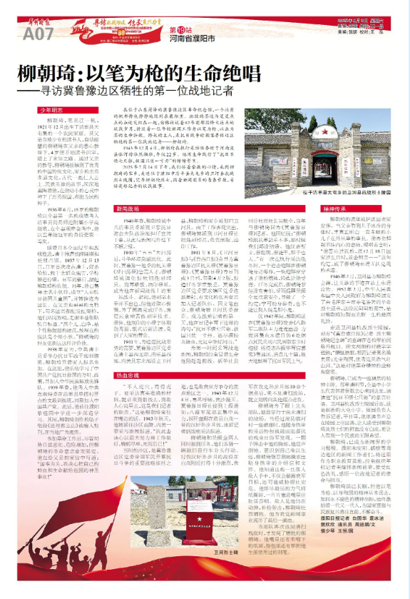 1943年12月4日,柳朝琦在执行采访任务时于河南浚县临河村壮烈牺牲,年仅22岁。他用生命践行了“抗日不惜七尺躯,救国只仗一寸丹”的铮铮誓言。
