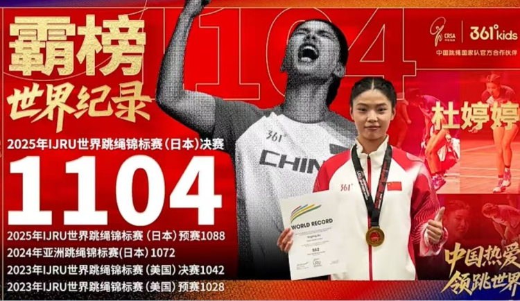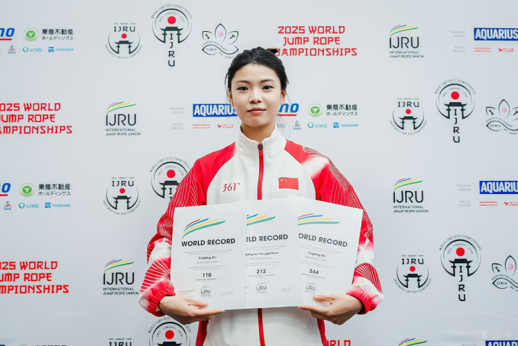 8月3日,从日本川崎2025年世界跳绳锦标赛上传来喜讯,河南姑娘杜婷婷在本次比赛中表现出色,和队友合作共获得四枚金牌并四次打破世界纪录。其中四枚金牌分别是:3分钟单摇跳,2×30秒双摇接力(段中飞、杜婷婷),4×30秒单摇接力(段中飞、杜婷婷、刘泽瑞康、梅嘉昊),车轮跳花样(杜婷婷、陈同林),除此之外杜婷婷还获得30秒单摇跳的银牌。