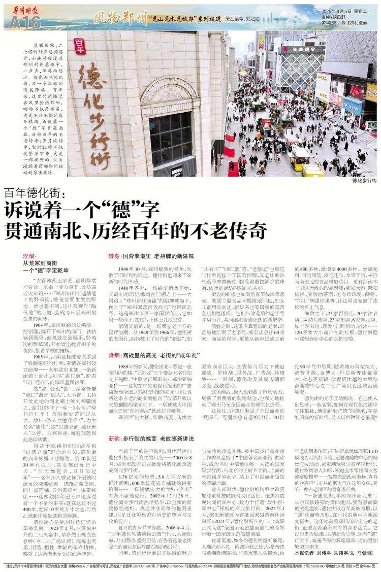 “一条德化街,半部郑州商业史”。从京汉铁路旁的货郎挑担,到智慧商圈的流光溢彩,德化街以百年商脉为根,以“德”化商魂为魄,在时代浪潮中不断蜕变新生。这条铭刻着郑州商业史诗的老街,正迸发着前所未有的青春活力。它以历史为底蕴,以创新为引擎,续写“德”行天下、商通四海的辉煌篇章,迈向更加繁荣的未来。
