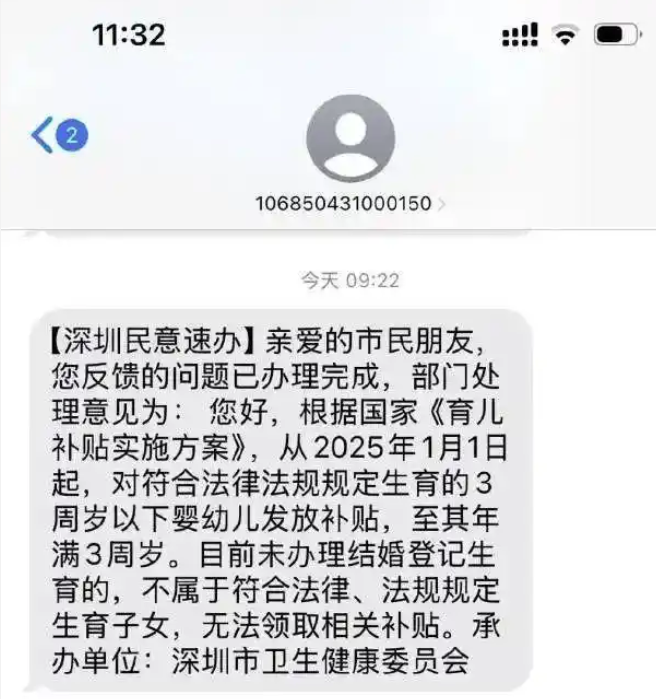 有网友发文反映称,自己收到深圳卫生健康委短信告知,因其未办理结婚登记而生育,不属于符合法律、法规规定生育子女,无法领取相关育儿补贴。对此,深圳市卫健委工作人员回应表示,当前政策中“符合法律法规规定生育”的界定确实以夫妻关系为前提。最终是否需要结婚证明,要以8月底上线的全省统一育儿补贴申报系统要求为准。